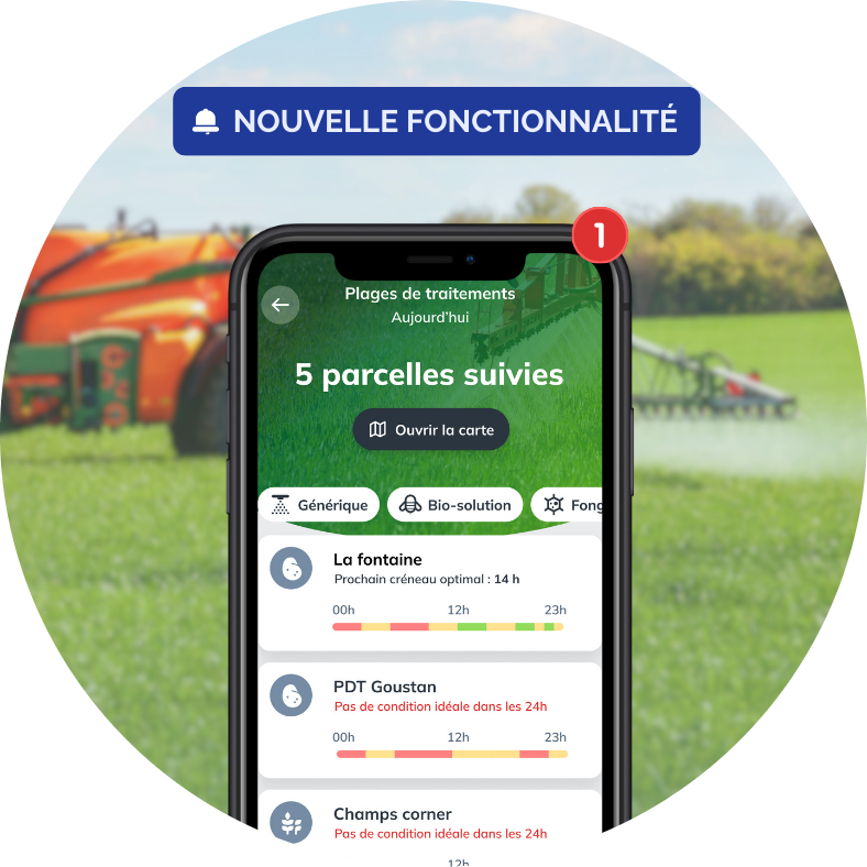 Visualisez l’ensemble de vos parcelles et des conditions de traitements optimales, non optimales ou défavorables sur les prochaines 24h.